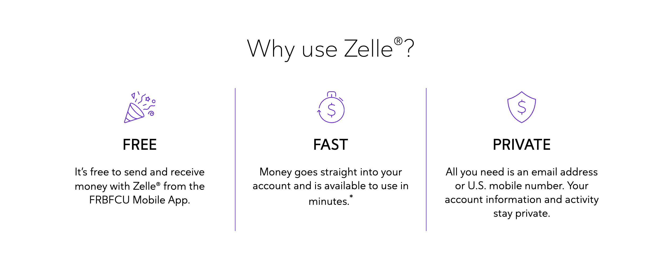 To receive money, just share your enrolled email address or U.S. mobile number with a friend and ask them to send you money with Zelle®. If you have already enrolled with Zelle®, you do not need to take any further action. The money will be sent directly into your FRB Federal Credit Union account, typically within minutes.
